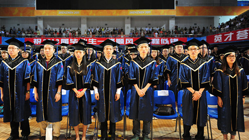 畢業典禮暨學位授予儀式在雄壯的國歌聲中開始。黎軍宣讀了深圳大學授予2013屆第二批本科生學士學位的決定,授予我校958名本科畢業生學士學位,其中37人獲法學學士學位、335人獲工學學士學位、153人獲管理學學士學位、5人獲建筑學學士學位、5人獲教育學學士學位、95人獲經濟學學士學位、88人獲理學學士學位、240人獲文學學士學位。