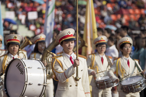 軍樂團奏響激昂的樂曲引領各學院運動員入場,運動員們身著顏色各異的30周年紀念衫,集合在主席臺前,接受檢閱,充分展現出深大學子們朝氣蓬勃、意氣風發的青春風貌。整隊完畢,全體起立,奏唱國歌。