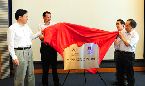5月29日,我校在國際會議廳D廳舉行了當(dāng)代中國思想文化研究所揭牌儀式暨提高文化軟實力建設(shè)文化強(qiáng)國的研討會。中國社會科學(xué)院馬克思主義研究院院長、書記鄧純東,中國社會科學(xué)院馬克思主義研究院創(chuàng)新工程首席研究員龔云,北京語言文化大學(xué)當(dāng)代中國研究所所長鄭承軍,深圳市委宣傳副部長李瑞琦,及香港理工大學(xué)應(yīng)用社會科學(xué)系、華南師范大學(xué)馬克思主義學(xué)院、中山大學(xué)馬克思主義哲學(xué)與現(xiàn)代化研究所、中山大學(xué)社會科學(xué)教育學(xué)院、華南理工大學(xué)思想政治學(xué)院等高校代表,我校黨委書記江潭瑜、副校長李鳳亮,宣傳部、社科部、社會科學(xué)學(xué)院負(fù)責(zé)人共同出席活動。