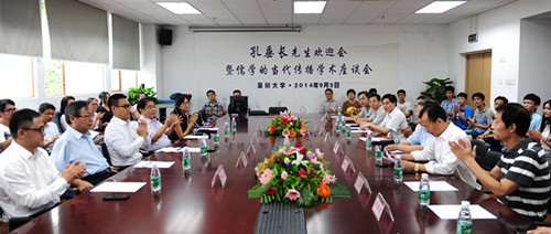 孔垂長感謝深圳大學提供這次兩岸學術交流機會,認為對促進儒學的傳播具有重要意義。他說,深圳大學是同特區一起成長的高校,時至今日,深大在教育科研領域碩果累累,煥發著青春活力。在辦學過程中,深大所堅持的有教無類、因才施教、厚積薄發、經世致用的原則與孔子的主要儒家教育思想高度契合。深圳作為外來文化進入中國的前沿陣地,各種思想交流碰撞,在這種環境下儒家思想的地位依舊穩固,證明了它自身強大的生命力和時代性。當前,儒家文化的傳播面臨著方式和手段的革新,應當強調把儒學文化的傳播與當代先進的科學技術手段結合,因人、因地、因時制宜。