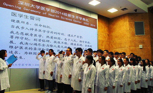 徐晨對參加此次開學典禮的嘉賓表示感謝。他說,深圳大學是一所年輕的大學,去年剛過而立之年,深大醫學部也是一個年輕的學院,今年才送走第一屆畢業生,年輕就意味著希望和更大的上升空間。醫學是深大重點發展的學科,在學校范圍內率先成立醫學部,探索在體制上的改革和創新,給予醫學部更多的辦學自主權和人財物的支持。“高端、精英、超前、精湛”是醫學部的辦學理念,希望同學胸懷理想,腳踏實地,刻苦專業,勇于奉獻,在醫學的道路上勇于攀登,不辱神圣的醫學使命。