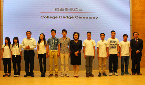 陶一桃、陳思平和管又飛為新生佩戴校徽并合影留念。