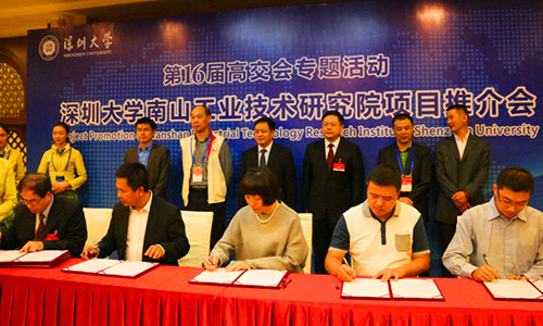 深大工研院與中國南山開發股份有限公司、深圳市東方富海投資管理有限公司、深圳市創東方投資有限公司、深圳市創展谷創新創業中心有限公司進行戰略合作簽約儀式;我校張慧生、馬永健、盧少平、李積彬、聶偉教授與新產業生物醫學工程股份有限公司、深圳市先亞生物科技有限公司等公司進行高交會項目簽約儀式。盧少平、李剛、徐淵、周莉、李堅強等老師介紹了智能搬運機器人、第四代免封裝LED芯片技術與產品、3D打印和掃描技術、人工角膜、智能家居系統等項目。