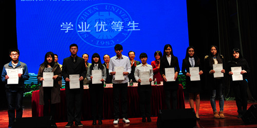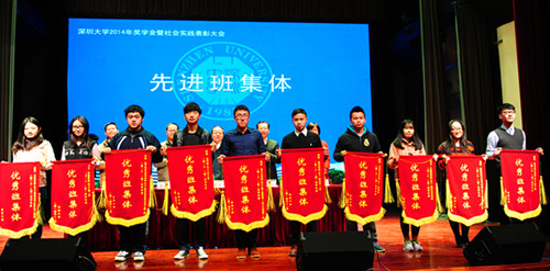 李鳳亮宣讀了《關于表彰深圳大學2013—2014學年度先進班集體和先進個人獲獎者的決定》和《關于表彰深圳大學2014年社會實踐先進集體和先進個人的決定》。2013—2014學年度,我校有137個集體獲先進班集體,3564名學生獲學業優等生,342名學生獲社會工作優等生,466名學生獲文藝體育優等生,1005名學生獲優秀學生干部,165學生獲學業創新優等生。雙休日社會實踐中,有5個團支部獲“標兵團支部”稱號,10個團支部獲“十佳團支部”稱號,30個團支部獲秀秀團支部稱號,191學生獲優秀個人稱號。暑期社會實踐中,3各學院獲優秀組織獎;分別有66篇調研報告、92份建言獻策、8份科技成果報告受到表彰;優秀團隊59支,優秀帶隊教師41名,優秀個人199名。