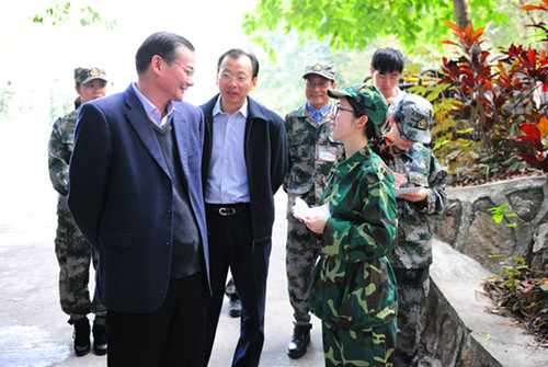 1月27日上午,我校黨委書記江潭瑜在承訓部隊武警廣東省邊防總隊第六支隊姚文紅政委、副校長李鳳亮以及軍訓工作相關負責人陪同下來到訓練場看望正在軍訓的2014級新生,并慰問工作在軍訓一線的承訓官兵。