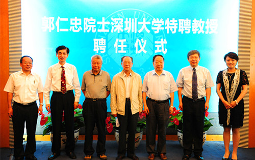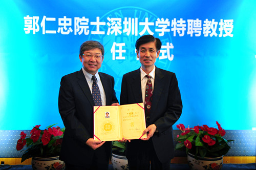 校長李清泉為郭仁忠院士頒發(fā)特聘教授的聘書,在全場的熱烈掌聲中,郭院士正式加盟深圳大學(xué)。