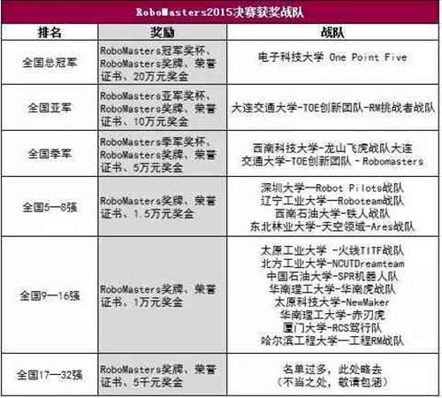 汪滔為RoboMasters2015全國大學生機器人大賽的總冠軍電子科技大學One Point Five戰隊頒獎(獎勵20萬元);李清泉為亞軍大連交通大學TOE創新團隊—— RM挑戰者隊頒獎(獎金10萬元);徐晨為季軍西南科技大學龍山飛虎戰隊與大連交通大學TOE創新團隊—— RoboMaters戰隊頒獎(獎勵各5萬元)。本次大會還設有“第5-8名”(獎金各1.5萬元),“優秀指導老師”、“優秀技術報告獎”等獎項。RoboMasters2015全國大學生機器人大賽圓滿閉幕。