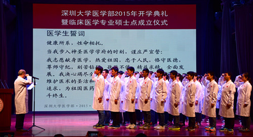 鐘南山院士親自為臨床醫學專業新生一一授白袍。他對我校醫學部的發展和進步表示祝賀,并對入學新生提出了殷切希望。他說,深圳大學為學生提供了良好的師資隊伍和硬件設施,但是學生仍然要有危機感,要將良好的條件當成是騰飛的翅膀而不是安樂的溫床。醫學部應當與企業、醫院緊密結合,相輔相成,促進彼此的發展。醫學有很深的文化底蘊,一個城市的醫療水平的提高需要不斷的培養和長期的積累,希望深大發揮引進人才的作用,依靠自身的力量推動自身和深圳醫療事業的發展。