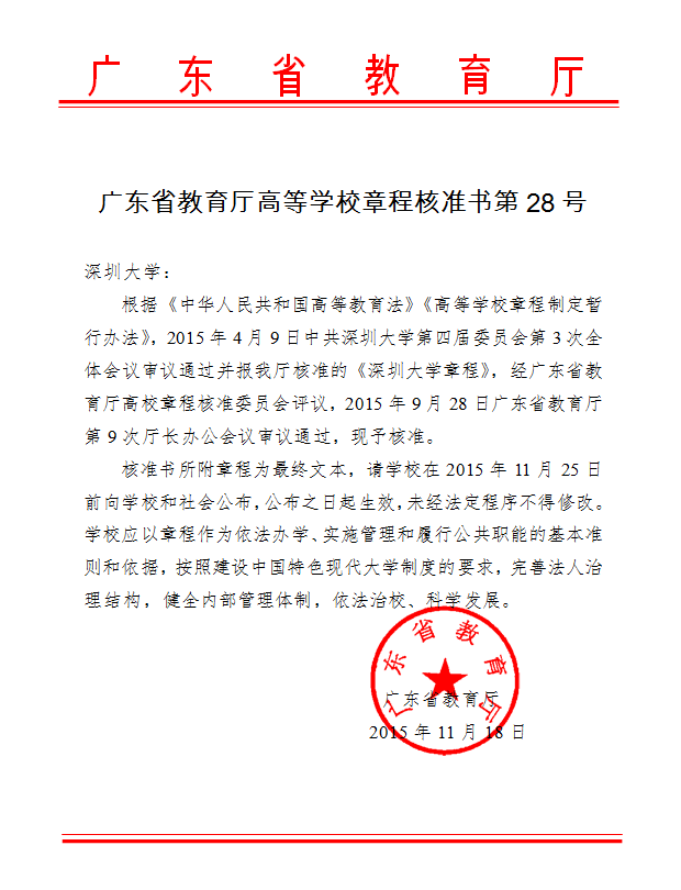 2015年11月18日,廣東省教育廳發布高等學校章程核準書第28號正式核準《深圳大學章程》,要求向學校和社會公布,并自公布之日起生效實施。