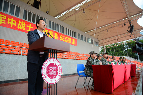 1月11日上午,冬風(fēng)烈烈,寒雨微微,深圳大學(xué)2015級(jí)新生軍訓(xùn)開(kāi)營(yíng)儀式在元平田徑場(chǎng)拉開(kāi)序幕。我校第二次冬季軍訓(xùn)開(kāi)營(yíng),參與本次冬季軍訓(xùn)的6437名新生將在校內(nèi)展開(kāi)為期十天的軍事訓(xùn)練及國(guó)防教育。廣東省武警邊防總隊(duì)六支隊(duì)司令部副參謀長(zhǎng)張翔,我校副校長(zhǎng)、軍訓(xùn)工作領(lǐng)導(dǎo)小組組長(zhǎng)李鳳亮到現(xiàn)場(chǎng)鼓舞、勉勵(lì)參訓(xùn)新生。