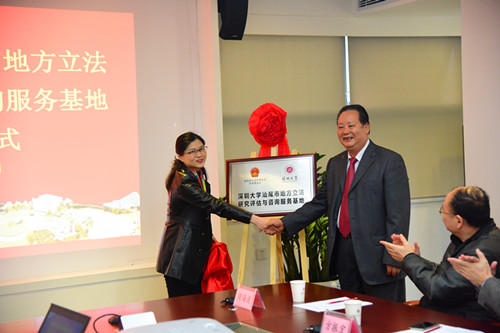 施勝章在儀式上代表汕尾市人大常委會對深圳大學汕尾市地方立法研究評估與咨詢服務基地的成立表示祝賀,并對深圳大學為汕尾市在民主法治建設方面做出的貢獻表示感謝。他說,此次基地成立是汕尾市推進地方立法工作的一件大事,在汕尾市和深圳大學之間架起了一座溝通的橋梁。也是貫徹黨的十八屆四中全會精神、落實省委和省人大常委會要求,加快推進地方立法研究評估與咨詢服務的一項重要舉措。他說,深圳大學是一所緊隨深圳特區步伐快速發展的,高水平、有特色、現代化的綜合性大學。汕尾市人大常委會與深圳大學合作建立立法研究基地,開創了特區高校與革命老區立法機關合作的新模式,有利于把深圳特區的改革創新精神與革命老區敢為人先的革命精神有機結合。推動地方立法工作要創新發展。希望基地的成立可以充分發揮深圳大學,乃至深圳特區的各種優勢,力爭成為汕尾市地方立法機關在全省范圍內的一流智庫。他誠摯地邀請基地的專家學者多到汕尾調研,深入了解汕尾實情,多形式,多方位地參與到地方立法工作中去。他也希望汕尾市人大法制工作委員會能加強與基地的聯系溝通,主動接受業務指導,及時保證專業技術的支持,早出成果、出好成果。實現良法善治,從而加快經濟發展。