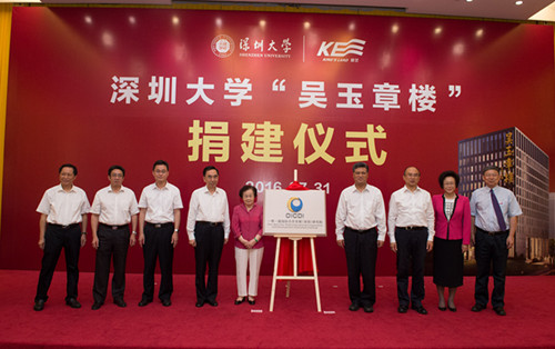 7月31日上午,深圳大學(xué)“吳玉章樓”捐建儀式在廣州市珠島賓館舉行。省委副書記、省長(zhǎng)朱小丹,省委副書記、深圳市委書記馬興瑞,副省長(zhǎng)藍(lán)佛安,深圳市市長(zhǎng)許勤,廣東省教育廳廳長(zhǎng)羅偉其,深圳市副市長(zhǎng)吳以環(huán),深圳市京蘭投資有限公司董事長(zhǎng)吳小蘭,深圳大學(xué)校長(zhǎng)李清泉等出席了捐建儀式。深圳市京蘭投資有限公司董事長(zhǎng)吳小蘭女士代表吳小蘭慈善基金會(huì)向深圳大學(xué)校長(zhǎng)李清泉贈(zèng)予捐建支票,并共同為“一帶一路國(guó)際合作發(fā)展(深圳)研究院”揭牌。羅偉其主持儀式。