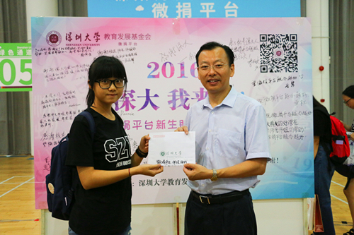 在報到場館內(nèi)眾多柜臺中,深圳大學教育發(fā)展基金會微捐平臺的柜臺無疑是今年報到現(xiàn)場的一處新亮點。在這里由深大校友為新生派發(fā)“1983教育助學金”。這筆助學金來源于深圳大學校友返校日暨微捐平臺發(fā)布儀式當場發(fā)起的“校友廣場1983多功能報告廳集體冠名”微捐項目。此項目由李清泉校長首捐,共計11983名校友參與。今年在微捐平臺組織的校友公正團的參與下共評選出50名新生作為“1983教育助學金”的首批資助對象,助學金標準為1000元/人。據(jù)悉此項助學金與學校其他助學金申請不沖突,學子可以兼得。此外助學金獲得者還有機會被推薦到校友企業(yè)實習以自強自立。李鳳亮在親臨現(xiàn)場指導工作時,在微捐平臺資金發(fā)放處題詞:來了就是深大人,祝微捐平臺越做越紅火!
