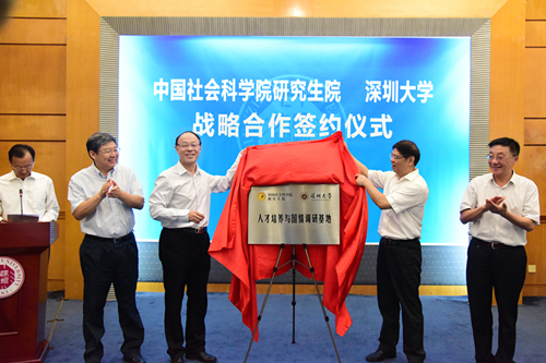 張政文與李清泉分別代表中國社會科學院研究生院與深圳大學簽署《中國社會科學院研究生院——深圳大學戰略合作框架協議》、《深圳大學與中國社會科學院研究生院聯合共建美學與文藝批評研究院協議》及《中國社會科學院研究生院與深圳大學合作培養博士研究生協議》。根據協議,雙方將以優勢互補、共同發展為原則展開合作,聯合培養博士研究生,首批合作領域將依托中國社會科學院研究生院承擔的“馬克思主義理論骨干人才計劃”的文藝學、新聞學、法學理論、國際關系、馬克思主義發展史、馬克思主義中國化等六個二級學科博士點招生,今后將每年招收15名博士生,并逐步開展相關學科博士后的培養工作。美學與文藝批評研究院還將創辦《美學與文藝批評》雜志、策劃、出版高水平的研究著作及叢書,舉辦“美學與文藝批評高端論壇”,力爭在較快時間內成為國內外有影響的人文科研機構。