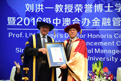 Paul Hemming博士向劉洪一頒發(fā)榮譽(yù)博士學(xué)位證書(shū)。