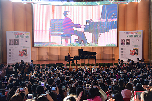 下午的大師課上,郎朗親自指導了通過選拔脫穎而出的9位小琴童,以新版《跟郎朗學鋼琴》為教材,示范了一堂大師級的音樂課。郎朗為小琴童悉心指導并精彩互動,詼諧的授課方式讓現場妙趣橫生。郎朗說,這次非常高興來到中國最美麗的大學-深圳大學,也非常高興成為了我校名譽教授,他為新版的《跟郎朗學鋼琴》教材的功能特點和知識性趣味性進行展示。他表示,現在是國際化的時代,教育的方法越來越多,對于琴童的教育也不能止步不前。他說,對小孩子來說貝多芬莫扎特離自己太遠,如何讓他們成為朋友呢,這就要找到一條讓人感到舒服易于接受的教育路徑,新書的出版也是基于此。新版教材更多的會讓鋼琴練習者注重整體效果而不是注意力只集中于單個的手指或手腕。郎朗還反復提到,未來的鋼琴教育要更多發揚帶有民族特色的原創鋼琴音樂,讓世界流行中國鋼琴音,讓鋼琴講出“中國話”。
