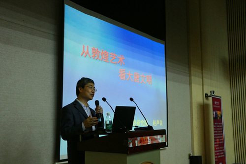 當晚,趙聲良在我校科技樓報告廳為我校師生帶來了“從敦煌藝術看大唐文明”專題講座。趙聲良從佛教寺院與石窟為出發點,循序漸進地為在場觀眾揭開了石窟文化和藝術的神秘面紗,闡明了在古時石窟、寺院對當時民眾文化的意義。他又從建筑的角度解釋了當時石窟藝術的地位。‘“俗講”就好比唐朝的“百家講壇”’形象生動地比喻使這個深奧又神秘的文化更易于理解。接著,趙院長還從唐朝節慶儀式、佛經、塑像、曲藝、經典拓本、文學作品甚至古代時尚等方面全方位地為大家展開了一幅唐朝文化盛卷。在場座無虛席,值得一提的是,互動環節,趙聲良為我校留學生同學提出的關于中國文化的問題的精彩回應飽含正能量,博得全場同學的熱烈掌聲。
