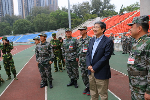 李清泉在看望過程中談到,在校內軍訓和在軍事基地軍訓只是軍訓的地方不同,它們的目的是一樣的——希望在不太長的時間里,通過軍事化的訓練培養同學們的團隊意識和自信心。李清泉稱贊道,今年軍訓的同學接受能力都非常強,很快掌握動作要領,軍體拳、方陣隊形都做得很好,他相信通過為期10天的軍訓,同學們一定會有比較大的收獲。他還希望同學們在訓練的同時多交流,互相觀摩訓練和比賽,增進友誼,促進各學院間的交流與整個學校的進步。