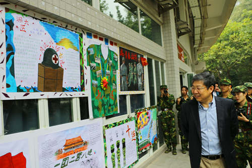 李清泉一行首先來到南區運動廣場,慰問正在進行正步走練習的二團同學。隨后來到二團團部,問候在這里工作的教官和輔導員,一路上參觀了二團布置的海報和宣傳欄,并在同學們作的詩歌和漫畫前駐足欣賞。