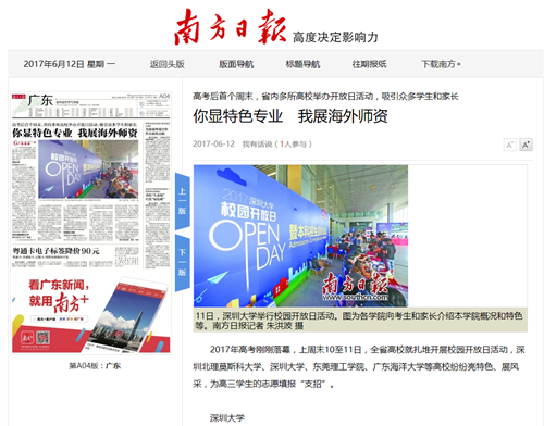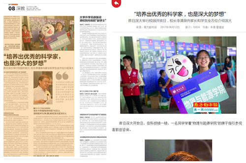 南方日報、南方都市報、廣州日報、深圳特區報、深圳晚報、晶報、深圳商報、騰訊大粵網、新浪網、網易、深圳新聞網、奧一網等媒體當天對我校開放日活動進行報道,共發布紙質版新聞11篇,網絡版新聞10篇。深圳特區報以《深大今年本科招生7400人》為標題在A3版大篇幅報道、南方都市報以《“培養出優秀的科學家,也是深大的夢想”》為標題在AⅣ版大篇幅報道,騰訊大粵網以《深圳大學校園開放日圓滿落幕》為標題進行詳盡報道,深大新聞網以《我校精心打造校園開放日暨本科招生咨詢活動》為標題進行詳盡報道,深圳大學報以《校園開放日,我把夢想唱給你聽》為標題整版報道,深圳大學微信公眾號、企鵝號和今日頭條號共發布3篇新聞報道,閱讀量超2萬。