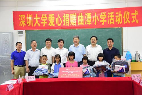 隨后,李清泉率隊奔赴我校精準扶貧精準脫貧對口幫扶村——河源市和平縣浰源鎮曲潭村。下午到達曲潭村后,李清泉一行在曲潭小學與和平縣、浰源鎮、曲潭村干部共同參加了深圳大學愛心捐贈曲潭小學活動儀式。儀式上,李清泉、徐晨和校友鄭劍宏向曲潭小學學生代表捐贈校服、運動鞋、書包、文具和體育用品等物資。和平縣縣委常委、縣紀委書記謝驥對深圳大學和校友企業對曲譚小學的愛心捐贈表示感謝,稱贊我校駐曲潭村扶貧工作隊在經濟發展、社會事業、基礎設施建設上全方位幫扶取得的成績。李清泉說,深大將進一步發揮自身的辦學特色和智力優勢支持曲譚村的長遠可持續發展,特別是在教育幫扶方面,支持曲譚村教師隊伍到繼續教育學院進修,全面提高教學質量;積極組織深大學生志愿者、校友到曲譚村支教,提升素質教學效果。深大全力支持曲譚村的新農村規劃、產業幫扶和醫療幫扶工作,將提供專家指導幫助,相應的專利以及平臺資源,切實做好精準扶貧工作。
