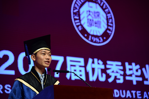 優(yōu)秀畢業(yè)生代表羅梓杰發(fā)表演講。他表達(dá)了對老師、親人的感謝和對同學(xué)的不舍,他認(rèn)為SZU中的S代表“search探索”,要在四年的大學(xué)生活中不斷地探索自己、探索未知;Z代表“zeal活力、創(chuàng)新”,要充滿活力,敢于創(chuàng)新,對未來充滿激情;而U代表“universal交融”,在校園里,和來自五湖四海的同學(xué)們一起交流,共同成長。畢業(yè)典禮更意味著人生的起點(diǎn),他將記得在深大的時光,用所學(xué)知識回饋親人和母校、社會。