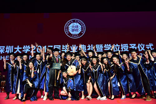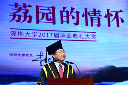 30多年來,十多萬深大校友投身特區(qū)建設(shè),從幼兒園老師到教授、博導(dǎo);從公司白領(lǐng)到公務(wù)人員;從律政精英到金融才俊;從代表中國制造征戰(zhàn)全球的科技達(dá)人到奧運(yùn)賽場(chǎng)高揚(yáng)五星紅旗的體育健兒;從打造城市空間的地產(chǎn)大亨到塑造城市精神的創(chuàng)意巨頭;從創(chuàng)業(yè)路上艱苦奮斗的年輕人到改變10億人生活方式,公司市值超過70%國家GDP的大boss,他們與這座城市共同奮斗、共同成長(zhǎng),全力參與、親身見證了小漁村蝶變?yōu)榇蠖际械钠孥E。這座城市的天際與隧道,高樓與街巷,到處奮斗著深大人的夢(mèng)想。2016年初次就業(yè)數(shù)據(jù)顯示,深大畢業(yè)生89%在深工作,多年來,這是絕大部分校友的共同選擇。十幾萬校友的背后是幾十萬個(gè)家庭和成千上萬家企業(yè)、團(tuán)隊(duì),他們和親人、朋友、同事及所有相關(guān)社群,共同構(gòu)成了一個(gè)強(qiáng)大的“深大圈層”。他們貢獻(xiàn)給城市的不僅是稅收,更是一整個(gè)營(yíng)商體系和創(chuàng)新生態(tài);不僅是勵(lì)志故事,更是一種改變與創(chuàng)造的文化品格;不僅是特區(qū)教育的成果背書,更是一座城市的未來和夢(mèng)想。同學(xué)們,請(qǐng)你們記住:無論身處何方,你們的笑容就是深圳的顏值;你們的奮斗就是深圳的夢(mèng)想;你們的未來就是深圳的未來!