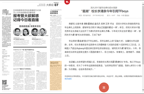 各級媒體共報道15篇,其中深圳特區(qū)報、南方都市報、深圳都市報、深圳晚報、深圳商報、南方教育時報、晶報共報道7篇,深圳特區(qū)報深圳特區(qū)報以《深圳大學8287名學生畢業(yè)》為標題在頭版顯著版面報道、深圳都市報以《“見證時代變革,擔當家國棟梁”——深圳大學舉行2017年畢業(yè)典禮》為標題進行詳盡報道,南方都市報以《深大2017屆畢業(yè)典禮校長致辭-“最潮”校長李清泉今年引用TFboys》為標題在AA07版大篇幅報道;騰訊·大粵網(wǎng)、南方+、深圳新聞網(wǎng)、讀創(chuàng)教育、深圳大事件、騰訊視頻等網(wǎng)絡新媒體報道8篇。深大新聞網(wǎng)以《畢業(yè)啦!深圳大學2017年畢業(yè)典禮拉開序幕 為期三天》為標題進行詳盡報道,騰訊·大粵網(wǎng)以《深大畢業(yè)典禮:獻禮最美荔園畢業(yè)生》為標題進行詳盡報道,南方+以《深大逾8000名學生畢業(yè),校長李清泉送了TFBOYS的這句歌詞!》為標題進行詳盡報道。