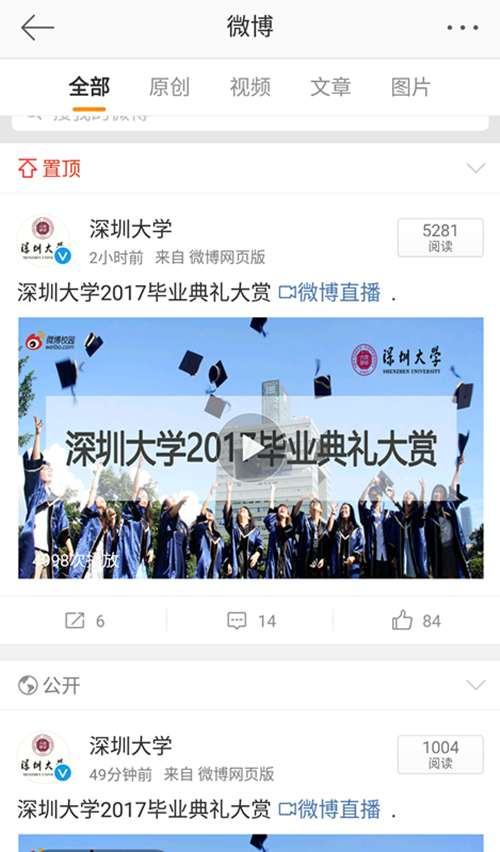 深圳大學微信公眾號共推送5篇有關表彰大會和畢業(yè)典禮的推文,總閱讀量超6萬 ,點贊數(shù)超 1266;深圳大學微博共發(fā)布博文19篇,閱讀超28萬,深圳大學今日頭條號共發(fā)布一篇文章,閱讀量超1萬。