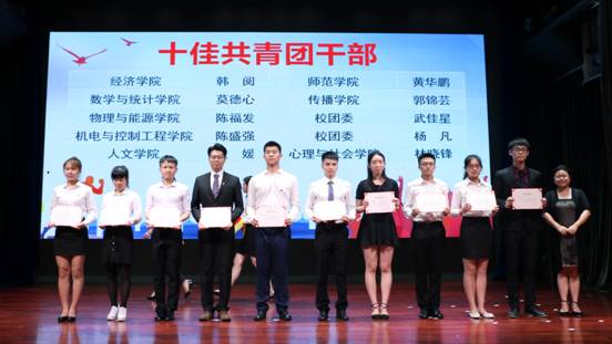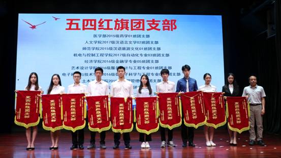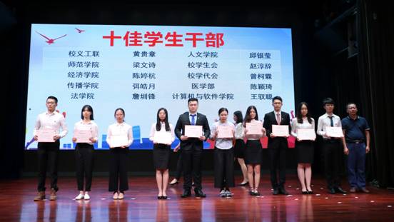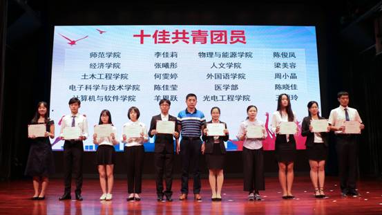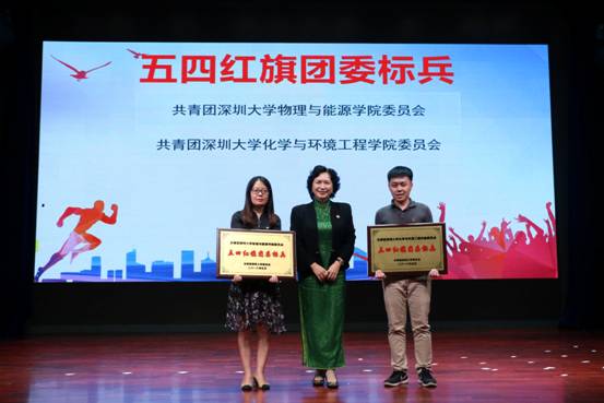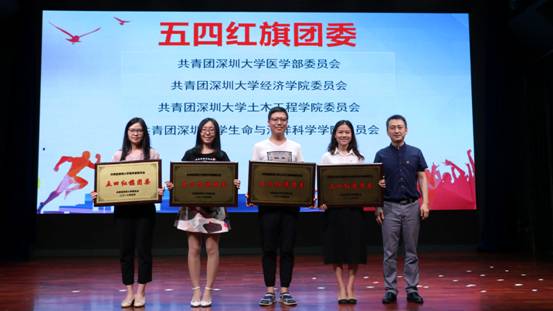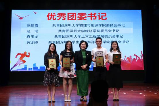 校團委書記殷濤宣讀了《共青團深圳大學委員會關于表彰深圳大學2017年度團學共作先進集體和先進個人的決定》。校團委授予共青團深圳大學物理與能源學院委員會、共青團深圳大學化學與環境工程學院委員會2個單位“五四紅旗團委標兵”稱號;授予共青團深圳大學醫學部委員會、共青團深圳大學經濟學院委員會、共青團深圳大學土木工程學院委員會、共青團深圳大學生命與海洋科學學院委員會4個單位“五四紅旗團委”稱號;授予共青團深圳大學機電與控制工程學院委員會等6個單位“共青團工作優秀獎”稱號;授予共青團深圳大學物理與能源學院委員會書記張建霞等4人“優秀團委書記”稱號;授予醫學部2015級藥學1班團支部等10個團支部“五四紅旗團支部”稱號;授予材料學院2016級高分子材料與工程專業3班團支部等76個團支部“百佳團支部”稱號;授予吳佳盛同學等56名同學“優秀團支部書記”榮譽稱號;授予李佳莉同學等10名團員“十佳共青團員”榮譽稱號;授予梁科幻同學等304名團員“優秀共青團員”榮譽稱號;授予韓閱同學等10名團干“十佳共青團干部”榮譽稱號;授予許章煌同學等99名團干“優秀共青團干部”榮譽稱號;授予黃貴章同學等10名學生干部“十佳學生干部”榮譽稱號;授予賀嘉雯同學等200名學生干部“優秀學生干部”榮譽稱號;授予閉波同學等199名同學“團學工作積極分子”榮譽稱號;授予深圳大學法學院喬遠講師等6位教師和社會人士“青年之友”榮譽稱號。