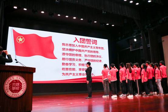 大會在莊嚴肅穆的奏唱國歌聲中開啟。奏唱國歌禮畢,高等研究院曾柯霖同學帶領新團員代表上臺,莊嚴宣誓加入中國共產主義青年團。全體團員起立共同宣讀入團誓詞,重溫入團的神圣時刻,紀念五四運動99周年暨中國共產主義青年團建團96周年。“為共產主義事業而奮斗”——這是深圳大學青年學子發出的錚錚誓言。
