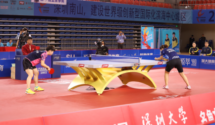 第三盤雙打,孫穎莎/王藝迪的迎戰(zhàn)馮亞蘭/錢天一。第一局,開(kāi)局便你追我趕,比分持續(xù)膠著,最終孫穎莎/王藝迪以11:6勝。第二局雙方互換場(chǎng)地,孫穎莎/王藝迪開(kāi)局領(lǐng)先,中間戰(zhàn)況膠著,最終深大隊(duì)以11:3勝。雙打局以2:0被深圳大學(xué)贏下。