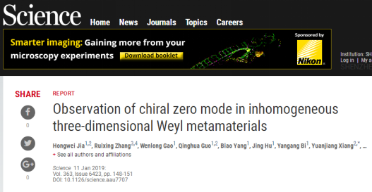 該工作得到了國家自然科學基金的資助。原文鏈接:H Jia, R Zhang, W Gao, Q Guo, B Yang, J Hu, Y Bi, Y Xiang, C Liu & S Zhang, “Observation of chiral zero mode in inhomogeneous three-dimensional Weyl metamaterials”, Science, 363, 148 (2019) DOI: 10.1126/science.aau7707