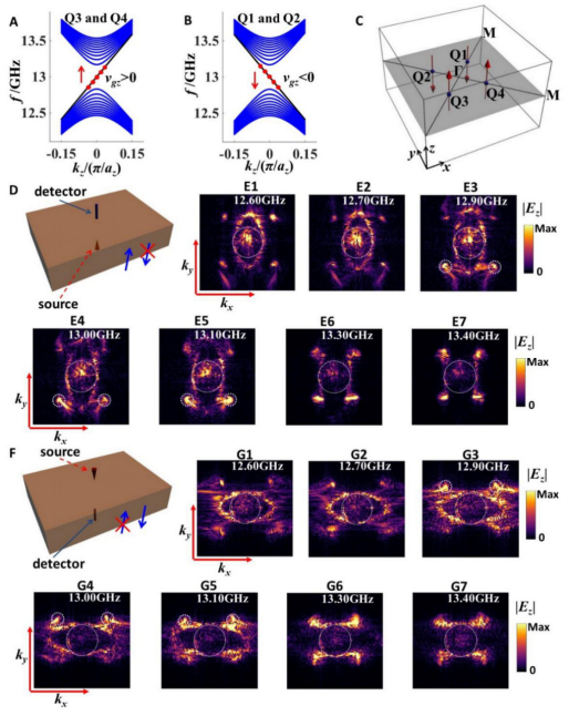 圖2. 非均勻外爾系統(tǒng)的手性朗道能級。A:外爾點Q3和Q4的朗道能級。零級模式的群速度向上。B:外爾點Q1和Q2的朗道能級。零級模式的群速度向下。C:四個外爾點的群速度分布的示意圖。D,F(xiàn):實驗測量的示意圖。E1-E7: 不同頻率的向上傳播的朗道模式的測量結(jié)果。在13G赫茲附近(E3-E5),只測到Q3和Q4的朗道零級模式(見虛線圓)。G1-G7:不同頻率的向下傳播的朗道模式的測量結(jié)果。在13G赫茲附近(E3-E5),只測到Q1和Q2的朗道零級模式(見虛線圓)。