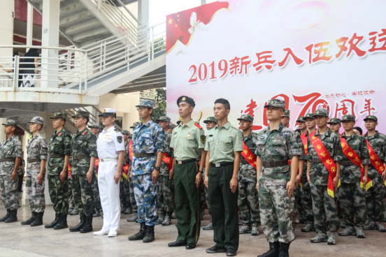 9月7日上午,我校在學生活動中心廣場舉行2019年新兵入伍歡送儀式,熱情謳歌2019年我校應征入伍的35男兵和10名待定女生。深圳大學副校長王暉教授,南山區武裝部政委朱佳春上校,各學院領導、老師、新兵家長、學生代表出席儀式和退伍兵代表出席了儀式。