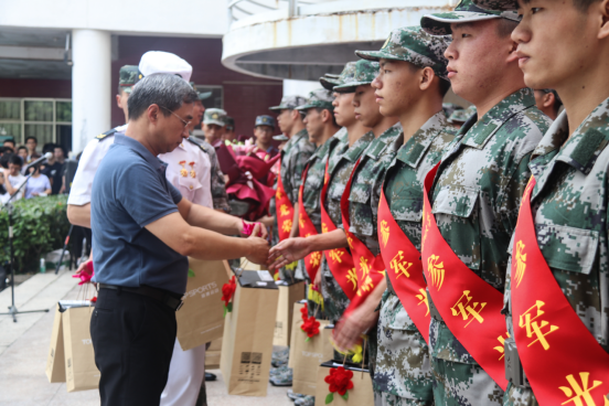 王暉校長囑托學生,要腳踏實地,自強不息,立足崗位發光發熱,鑄造輝煌軍旅人生。隨后,王校長和朱政委與新兵親切握手,并贈送紀念品和鮮花。儀式最后,樂隊奏響中國人民解放軍軍歌,出席領導與新兵合影留念。