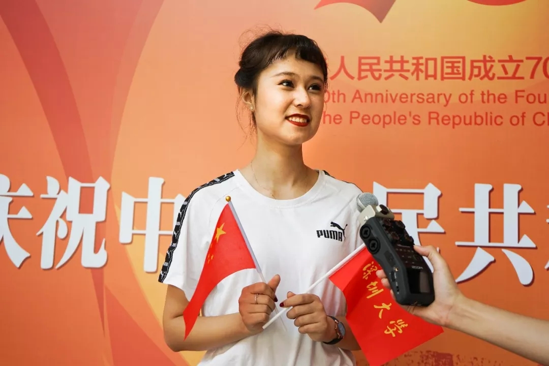 觀看直播之前,在國際會議廳大廳現場的師生們充滿熱情地向祖國表白。來自深圳大學預備役連的兩位同學在臺上分別舞動國旗和深大校旗,臺下的師生們則揮舞手中的小國旗,一起合唱深大版《我和我的祖國》,唱完后大聲對祖國、對深大表白:“我在深圳,我愛中國!”“我愛中國,我愛深大!”聲音響徹整個大廳。