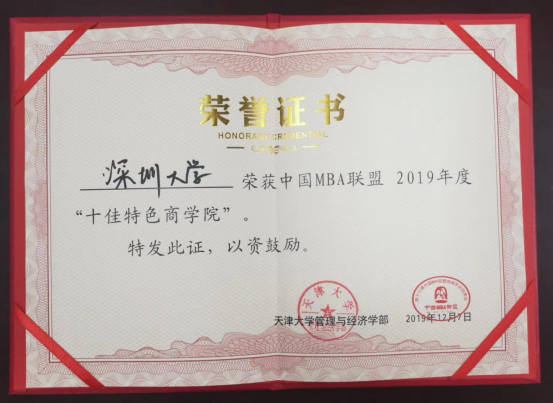12月7日-8日,第十三屆中國MBA聯盟領袖年會暨商學院高峰論壇在天津重舉行。深圳大學管理學院榮獲年會最具分量的“十佳特色商學院”大獎。深圳大學MBA 2014級學生陳杭州榮獲中國MBA聯盟2019年度“中國MBA新銳獎”。