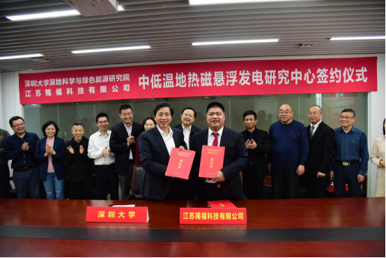 1月9日下午,深圳大學(xué)深地科學(xué)與綠色能源研究院和江蘇賜福科技有限公司合作簽約儀式暨“中低溫地?zé)岽艖腋“l(fā)電”研究中心成立儀式在深圳大學(xué)粵海校區(qū)舉行。雙方就科技創(chuàng)新推動粵港澳大灣區(qū)地?zé)崮荛_發(fā)達成共識,簽署“中低溫地?zé)岚l(fā)電磁懸浮發(fā)電原理技術(shù)和裝備”與“月基磁懸浮發(fā)電系統(tǒng)技術(shù)與裝備”等科技合作協(xié)議,江蘇賜福科技有限公司將專門投入1500萬科研經(jīng)費用于相關(guān)研究。