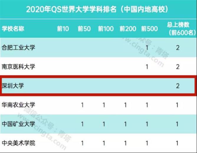 本次排名橫跨5大學科群和48個學科,評估了全球83個國家地區的1368所高校。中國高校表現亮眼,共有118所大學的1066個學科入選全球600強(中國內地84所,中國香港9所,中國臺灣23所,中國澳門2所)。在工程與科技學科、自然科學學科當中,深圳大學各有一個學科入選全球600強,分別是工程與科技學科的“物理學與天文學”和自然科學學科中的“計算機科學與信息技術”,其中“物理學與天文學”學科在入選的內地高校中排名第30,“計算機科學與信息技術”學科在入選的內地高校中排名第31。