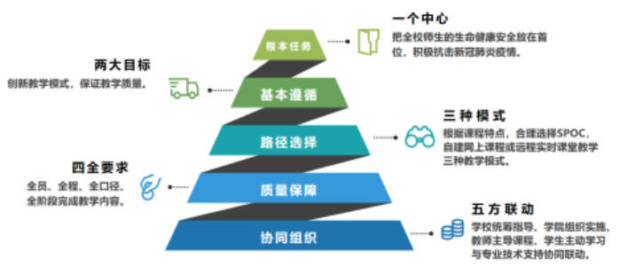在疫情防控關鍵時期,深圳大學按照“安全、有序、保質、保量”的要求,遵循“開學不返校,停課不停學”的原則,制定線上教學實施方案,開展新學期第一階段教學工作,創新教學模式,保證教學質量,積極服務本校師生,同時依托UOOC聯盟,為全國各高校提供教學資源、技術服務和師生培訓,貢獻“深大力量”。該方案不僅是疫情防控時期的應急方案,也是學校以應急需要為發展機遇,深入推動的一次教學創新行動。該方案富有特色,可謂深大獨創,可總結為:一個中心、兩大目標、三種模式、四全要求、五方聯動。
