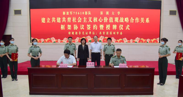 7月1日下午,75610部隊與深圳大學建立共建共育社會主義核心價值觀戰略合作關系框架協議簽約暨授牌儀式在深舉行。75610部隊、深圳大學和共青團深圳市委主要領導50余人出席儀式。儀式由75610部隊政治委員雷鳴主持。