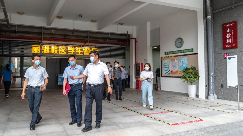 李永華首先聽取了麗湖校區(qū)管理辦公室主任阮彬關(guān)于麗湖校區(qū)開學(xué)前各項準(zhǔn)備工作的匯報,并實地查看疫情防控工作,他前往學(xué)生餐廳、學(xué)生宿舍了解開學(xué)前準(zhǔn)備工作。在學(xué)生餐廳,李永華向工作人員詳細(xì)了解餐廳開放座位及用餐人數(shù)等,他強(qiáng)調(diào)要充分做好飯菜供應(yīng)和食品安全工作,保障返校學(xué)生就餐。在學(xué)生宿舍,李永華察看宿舍人臉識別門禁系統(tǒng),并仔細(xì)詢問返校學(xué)生人數(shù)、新生宿舍床位等問題,他指出要扎實做好學(xué)生返校及新生入學(xué)的后勤保障工作, 要加大對返校學(xué)生的人文關(guān)懷,切切實實落實好各項工作。