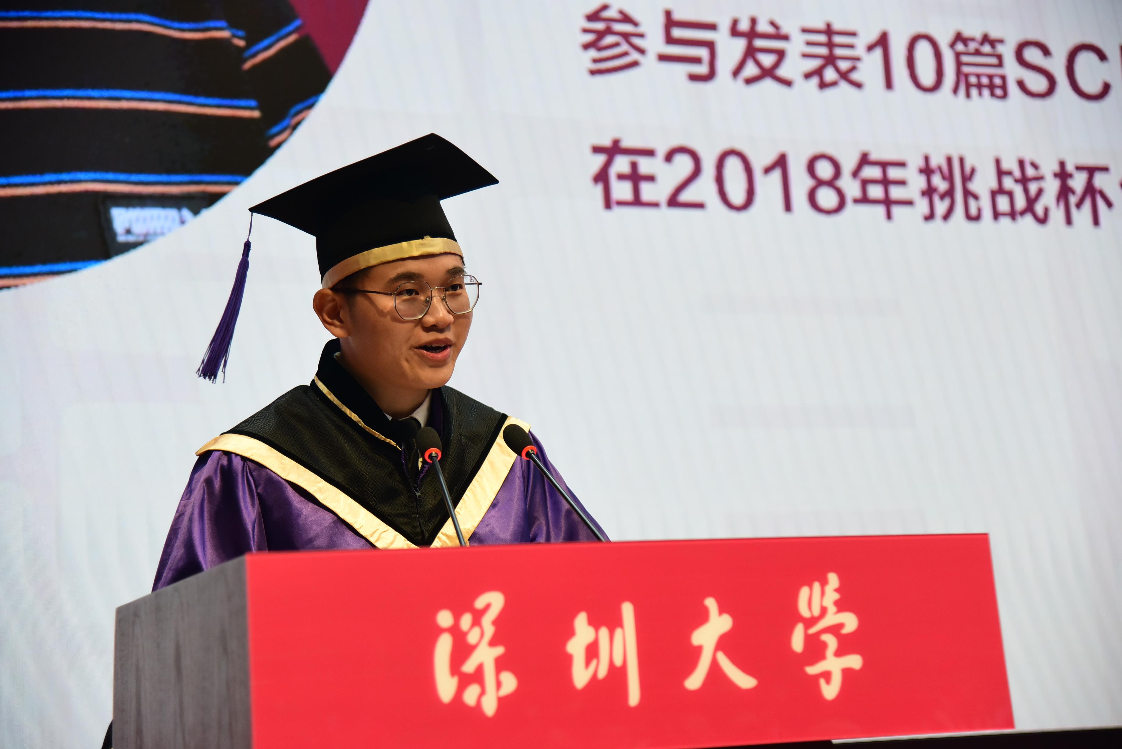 機電與控制工程學院機械工程專業2018級碩士研究生林澤洲作為畢業生代表發言。他細數了七年的荔園時光,有理想有奮斗,有創業國賽金獎有SCI,有演會中心的球賽亦有荔枝樹下的人生暢聊。他感恩深大、師長、同學們所有的給予,“他們無一不激勵著我們要時刻做一個開拓進取的深大人。世界這么大,我躺在深大的懷里看太陽。”林澤洲最后勉勵同學們,砥礪前行,在今后學習、工作中用豐碩的成果回饋母校,讓深大為我們而自豪!