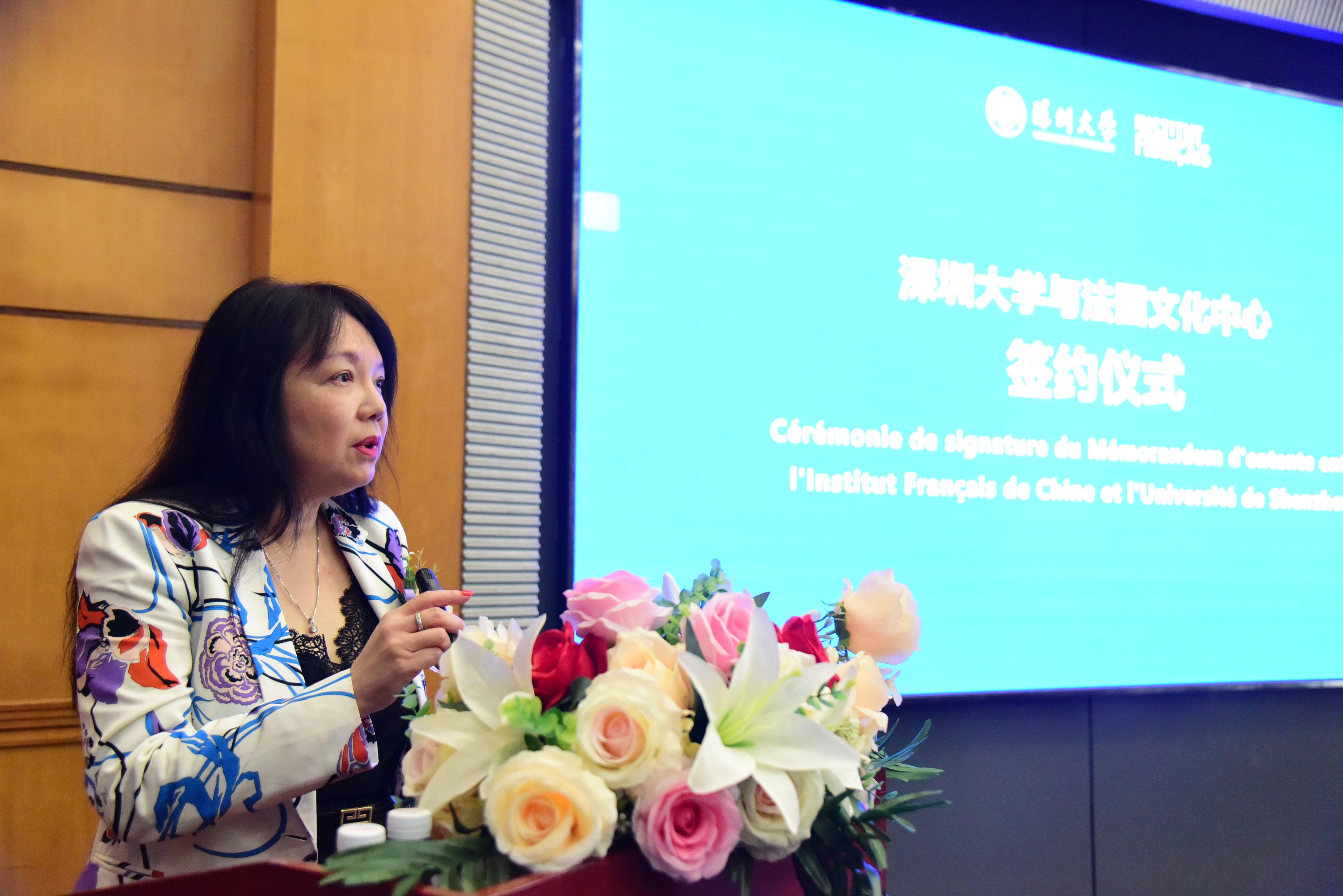 周麗君在致辭中感謝深圳大學的邀請,并對深圳法語聯盟正式落地深圳大學表示衷心祝賀。她希望以此為契機,加強中法青年之間的學習與交流,為深圳大學與法國高校之間開展校際合作提供一個新的平臺。她表示,法語聯盟的使命不僅僅是法語教學,更是推廣豐富多彩的法語文化。“深圳法盟”作為落戶中國的第16家聯盟機構,將搭建起深圳與法國在文化和教育領域合作與交流的平臺。同時,法盟作為中法兩國文化交流的重要載體,也將進一步加強深圳高校與法語國家與地區的交流與合作。深圳法盟愿意同深圳大學深化合作,共同推進中法合作項目落地深圳,不斷拓展在人才培養、學術培養、文化藝術等領域的深入合作。