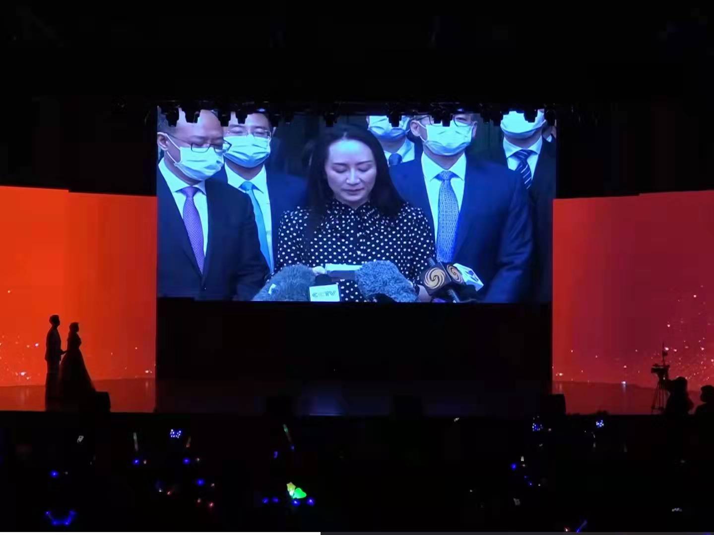 熒幕上,深圳大學(xué)1993屆會計(jì)系校友孟晚舟從容步下舷梯的一幕,再次令在場師生百感交集。流行音樂系教師張雨晨、李悅的男聲二重唱《人民的旗幟》唱出深大人對英雄校友孟晚舟的掛念和別樣深情。