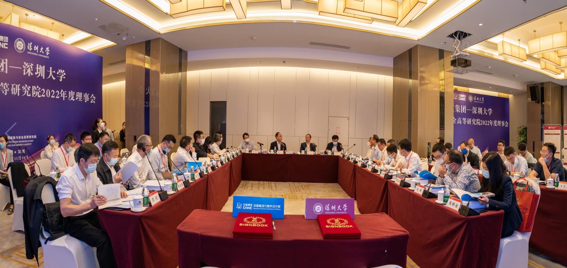 2022年11月10日上午,中核集團-深圳大學中國核能與安全高等研究院(簡稱“核高院”)2022年度理事會在深圳市福田區格蘭云天大酒店召開。中核集團黨組成員、副總經理曹述棟一行,中核集團總經理助理、中國寶原黨委書記、董事長孟琰彬一行,中國核動力研究設計院院長王叢林一行,廣東市場開發部主任、深圳中核集團有限公司黨委書記、董事長李志煌一行,同方股份有限公司黨委委員、董事會秘書張健一行,深圳大學中國科學院院士、校長毛軍發,副校長張學記,物理與光電工程學院執行院長、核高院院長劉永一行等出席會議。曹述棟主持會議。