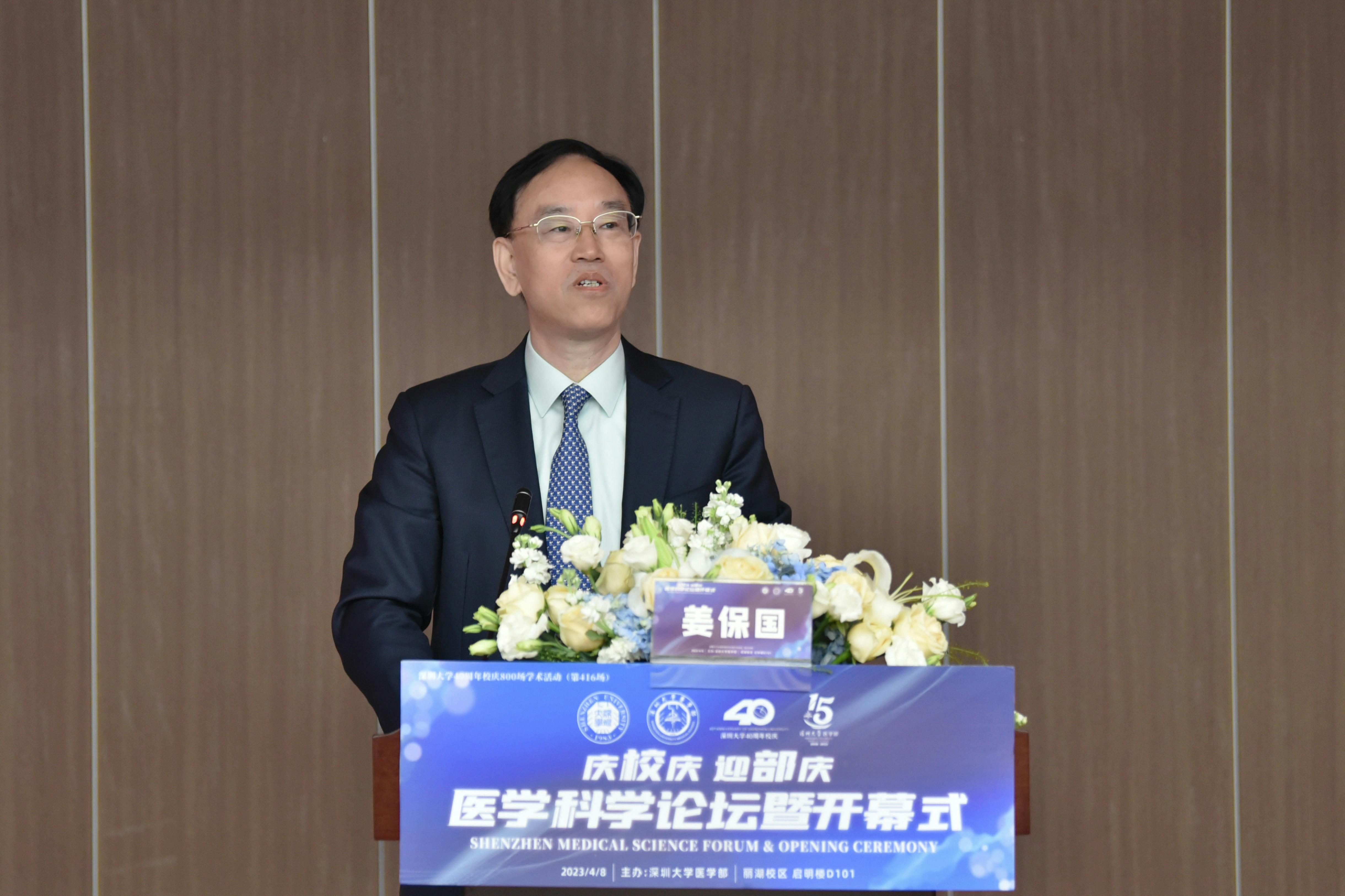 中國工程院院士、深圳大學醫學部主任、深圳大學總醫院院長姜保國介紹了深大醫學的建設發展背景,描繪了深大醫學未來科技引領的醫學教育發展之路,提出未來醫學部將規劃建設與國際接軌的醫學教育平臺、供人才發展的醫學研究平臺、與企業合作的企業開發轉化平臺;計劃在市衛健委指導下與深圳各級醫院合作創建臨床醫學研究中心,建立深圳第一個醫學繼續教育中心,為醫護人員提供全周期服務。姜保國表示,希望帶領深大醫學擔起深圳醫療衛生健康發展“兄長”的責任,合力推進深圳醫療衛生健康事業的健康發展。
