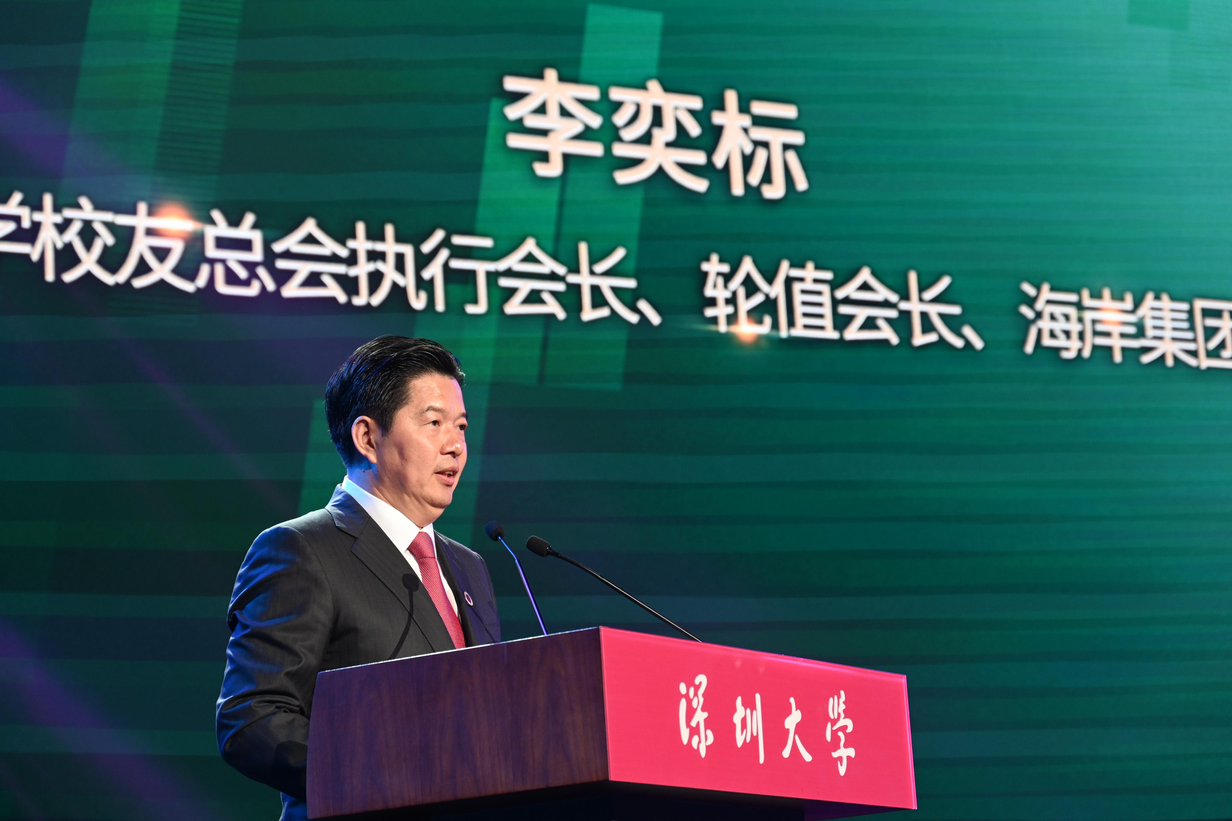 “參天之木,必有其根;懷山之水,必有其源。”李奕標在致辭中說,時光流轉,回想當年在深圳大學的求學歲月,他深切感受到母校的關懷和培養。在大學里,學習的不僅是文化知識,更重要的是老師們言傳身教的為人品質。深大“自立、自律、自強”和“腳踏實地”的精神理念,對他影響至今。李奕標說,作為深圳大學校友,他一直關注母校的發展,銘記母校的培育之恩,并以感恩之心回饋母校;作為校友企業,海岸集團將和深圳大學共同成立專項基金,一如既往支持母校的發展,助力深圳大學建設成為世界一流綜合性大學;作為深圳大學校友總會執行會長,他將在未來工作中充分發揮校友會的平臺作用,搭建校友之間交流合作的橋梁,為母校的建設和發展出一份力。“我們將通過校友平臺,推動深大 30 多萬校友與世界交流合作、增強校友凝聚力、提升校友影響力、培養校友創新力、發揮校友創造力,打造全國乃至國際校友會的標桿。”