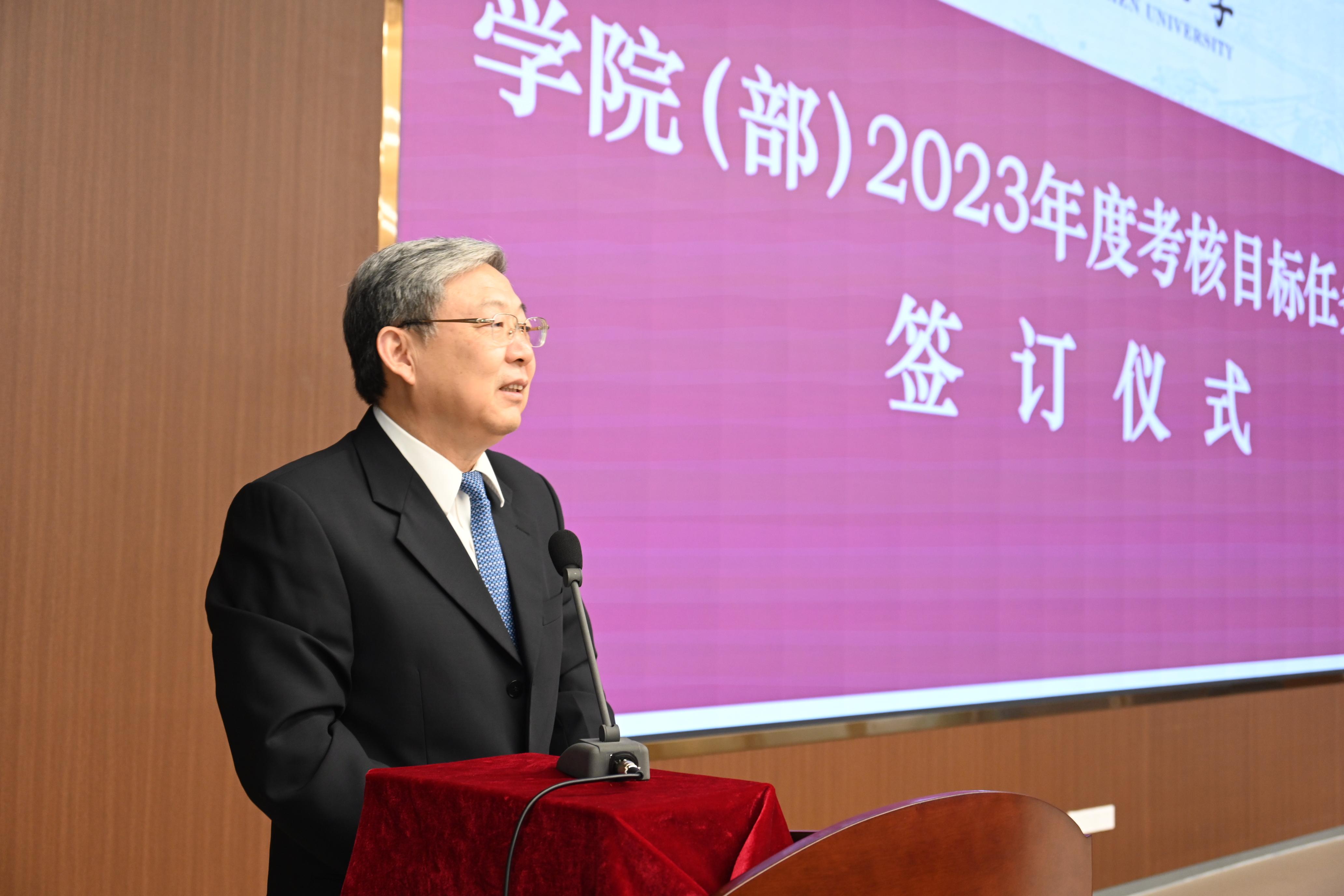 李清泉在儀式上強調(diào),2023年是學(xué)校“十四五”發(fā)展的關(guān)鍵之年,學(xué)校將進(jìn)一步加快發(fā)展戰(zhàn)略的實施步伐,推動校院兩級統(tǒng)一聯(lián)動,實現(xiàn)高質(zhì)量發(fā)展。他指出,當(dāng)前高等教育正面臨新一輪深刻變革,黨的二十大報告首次將教育與科技、人才作一體化部署。在“雙區(qū)”疊加、“雙區(qū)”驅(qū)動的背景下,深圳大學(xué)更需要主動擔(dān)當(dāng)起服務(wù)支撐教育強國、人才強國、科技強國建設(shè)的戰(zhàn)略使命,順應(yīng)國家發(fā)展趨勢,滿足城市要求,建設(shè)成為世界一流綜合性大學(xué)。為此,李清泉要求,學(xué)院(部)方面要高度重視此次責(zé)任書的簽署,要調(diào)動全體教職工的積極性、創(chuàng)造性,以“時不我待”的緊迫感、“舍我其誰”的使命感以及“功成必定有我”的責(zé)任感,全力以赴推動各項目標(biāo)高質(zhì)量完成;全校要始終保持創(chuàng)新精神,在人才培養(yǎng)、科學(xué)研究和社會服務(wù)等方面作出深大貢獻(xiàn);要注重科研與教學(xué)融合,將科研優(yōu)勢轉(zhuǎn)化為人才培養(yǎng)優(yōu)勢,與國家人才計劃對接,培育可持續(xù)發(fā)展的人才梯隊。